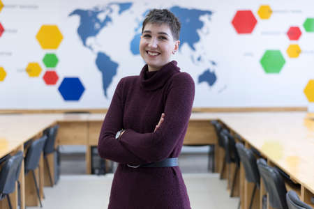 Portrait of beautiful and intelligent female primary school teacher against background of her classroom. Caucasian woman is smiling at camera against background of small children sitting at desks.