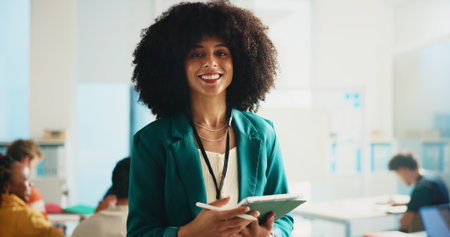 Woman, professor and tablet in portrait, classroom and happy for career, education and students at college. Person, teacher and tech with application for lecture, lesson and curriculum at university