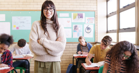 Portrait, tutor and woman with arms crossed, classroom or pride for teaching children and education. Knowledge, teacher and person with smile in school, teens and writing exam for curriculum or learn