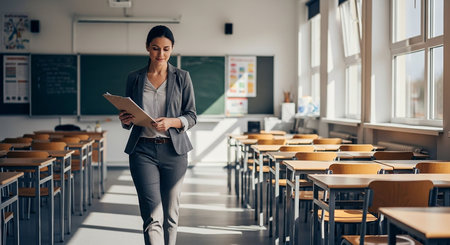 This portrait features a smiling female teacher in her 50s, exuding warmth and professionalism in a dynamic classroom environment, encouraging student engagement and learning.