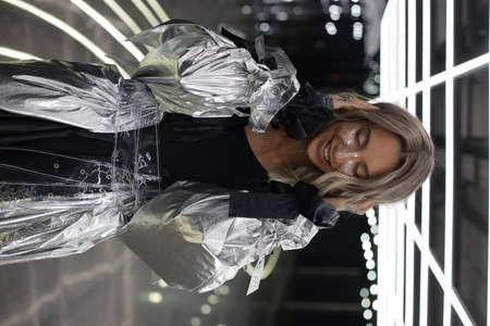 portrait of a bright blonde girl with sequins on her cheeks which stands in a metallic-colored cloak in a room where there is a lot of bright light. High quality photo