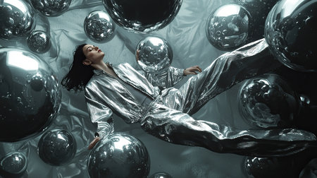 Model floats gracefully among reflective spheres in ethereal underwater setting