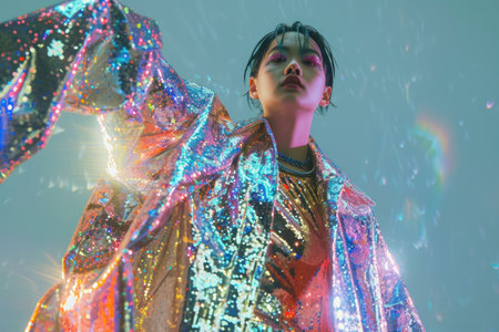 Futuristic fashion model in reflective space, flaunting modern outfit