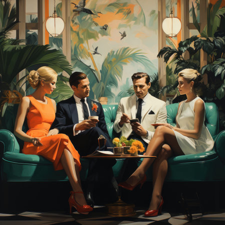 Group of elegant people well-dressed in retro styles hanging out together, having fun with drinks at the luxury restaurant during the grand celebration