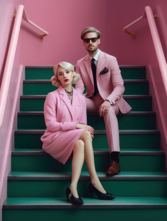 Fashionable couple in pink outfit posing sitting on stairs. Fashion concept, trendy people. Generative AI