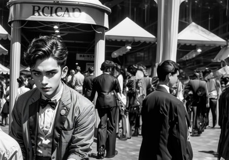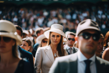A woman wearing a white suit and hat confidently navigates through a bustling crowd, crowd people in Melbourne cup day, AI Generated