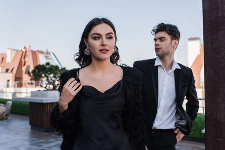 woman in faux fur jacket hugging elegant man in suit outdoors, banner