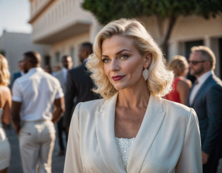 photo of beautiful middle aged woman with white dress standing in street with crowd of people, generative AI