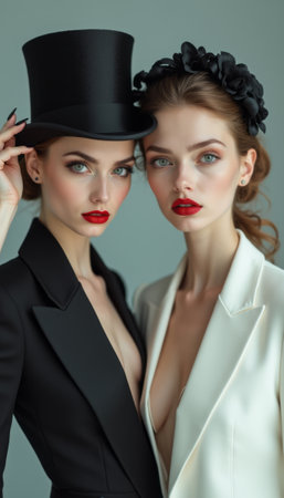 Two stunning models, one in a sleek black suit with a top hat and the other in a chic white blazer, exude confidence and glamour. Their bold red lips and captivating gazes create a powerful visual contrast, showcasing the beauty of high fashion and sophistication.