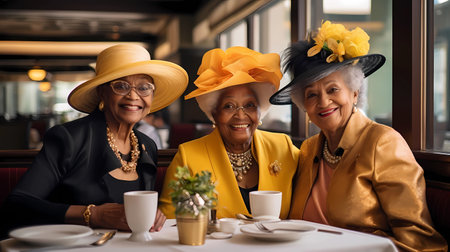 An AI generated illustration of three elderly female friends in elegant clothes enjoying a meal together in a restaurant