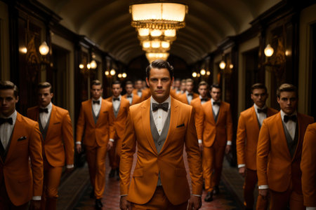 An AI generated illustration of professional men in business suits walking down a corporate hallway