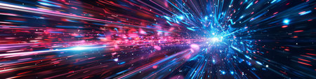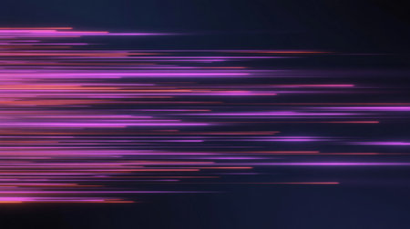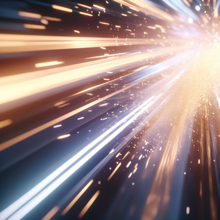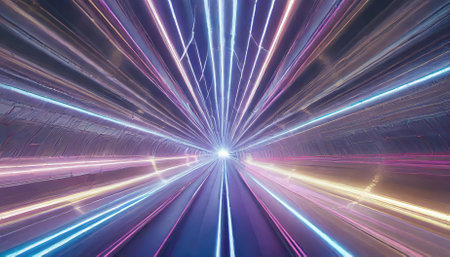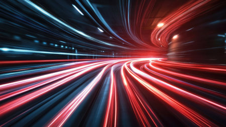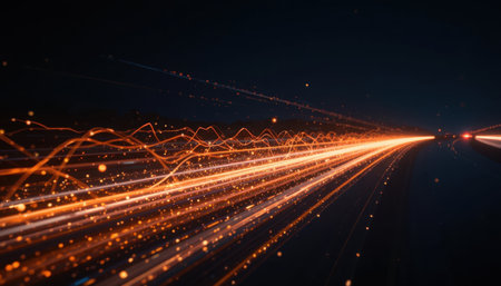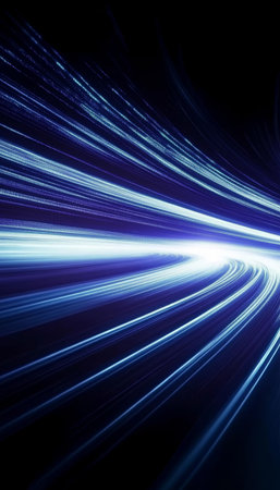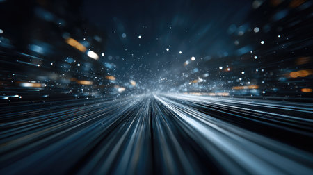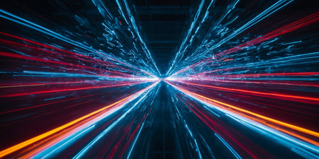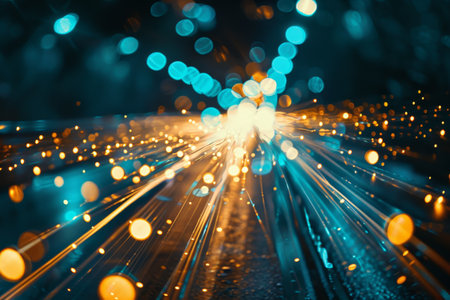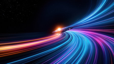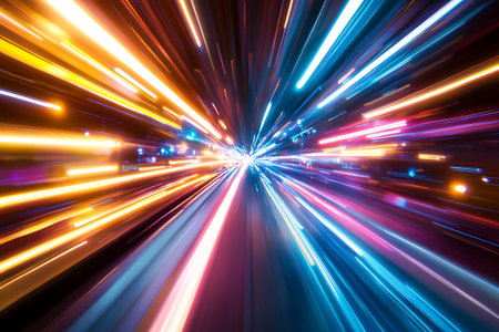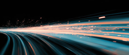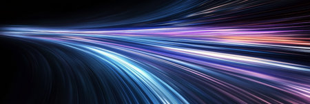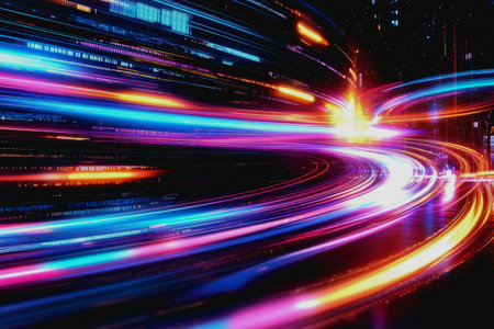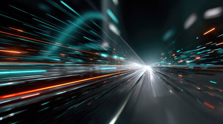 This visually striking image captures the essence of motion and speed, featuring vibrant light trails and bokeh effects against a dark backdrop. Perfect for technology themes.