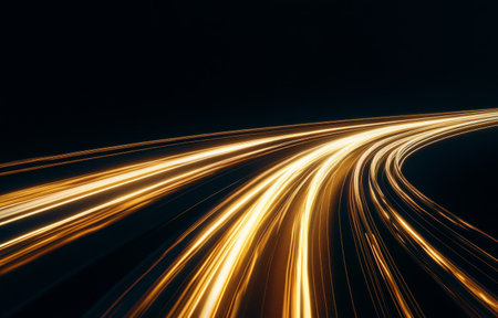 This abstract image showcases dynamic light trails that convey a sense of speed and motion against a dark backdrop, making it ideal for technology and energy projects.