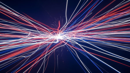 Red, white, and blue light streaks explode outwards on a dark background.
