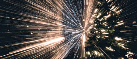 Colors burst into light as stars speed by in this imaginative scene merging the spirit of Christmas with the vast wonders of space exploration.