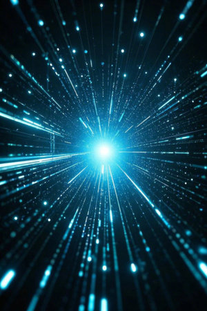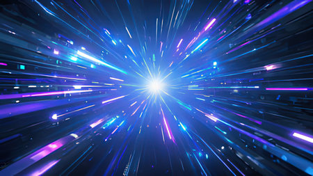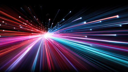 Colorful light rays burst outward from a bright central point in an abstract representation of speed and energy
