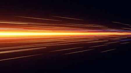A dynamic abstract depicting numerous bright streaks of orange and yellow light rapidly moving from left to right across a dark, almost black background. The lines are sharp and distinct at the leading edge, blurring into a luminous trail, conveying a strong sense of speed and motion. The intense glow of the light creates a powerful visual impact, suggesting concepts of velocity, technology, or energy transfer.