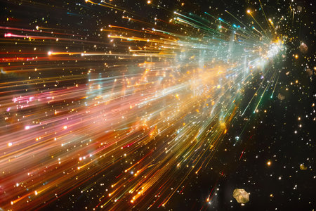 Illustration of collection of light trails from comets, each with their own distinct color and shape, against the black background of space. the composition includes multiple streaks in various hues representing different comet paths, creating an abstract yet dynamic visual effect. this is a high-r