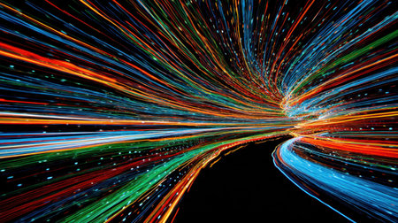 This vibrant image features colorful light trails in motion against a dark background, perfect for themes of technology, innovation, and energy.