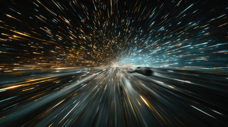 A stunning depiction of a futuristic warp drive scene, showcasing dynamic light trails and a vibrant starfield, evoking a sense of speed and adventure in space.