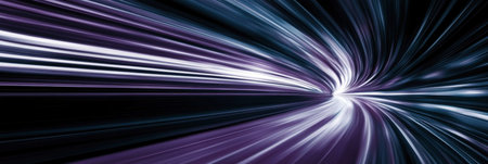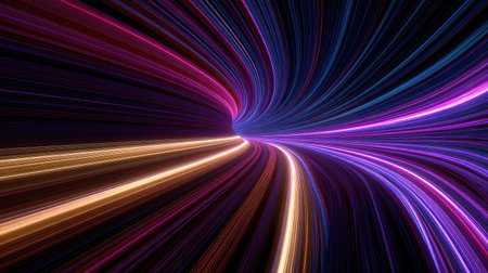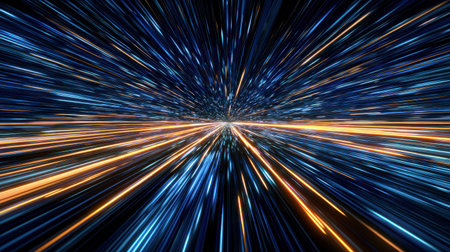 An abstract representation of a tunnel filled with swirling trails of vibrant blue and orange light. The streaks of light create a sense of immense speed and motion, the viewer into a futuristic...