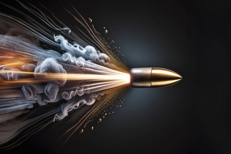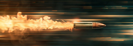 Powerful visual of bullet in motion leaving fire and smoke trail, symbolizing violence, energy, or firearm dynamics.