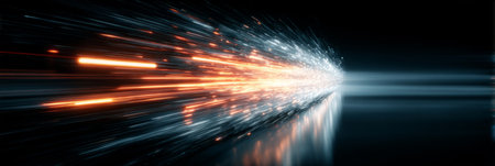 A dynamic abstract depicting numerous bright streaks of orange and yellow light rapidly moving from left to right across a dark, almost black background. The lines are sharp and distinct at the leading edge, blurring into a luminous trail, conveying a strong sense of speed and motion. The intense glow of the light creates a powerful visual impact, suggesting concepts of velocity, technology, or energy transfer.