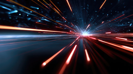 Colorful light streaks radiate against dark backdrop, creating dynamic background, AI generated