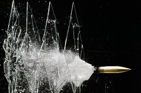 A bullet impacts and breaks through glass, creating shards and an explosion of debris during the moment of collision.