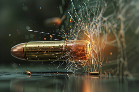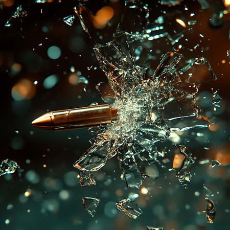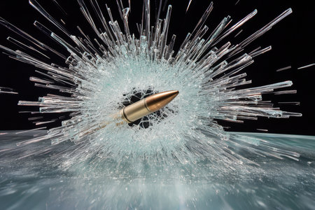 A bullet strikes glass, resulting in a dramatic explosion and scattering fragments across the surface.