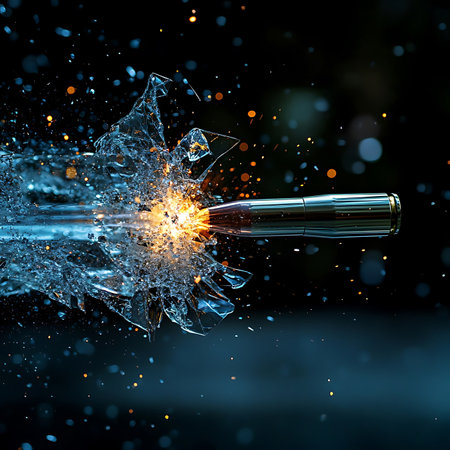A bullet disrupts glass, causing a dramatic explosion of shards in varied directions.