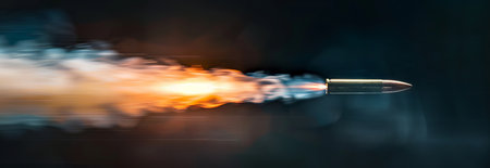 Close-Up of a Flying Bullet with Sparks and Smoke Trail. Concept of Ammunition, Firearms, Ballistics, Shooting Accuracy. Banner.
