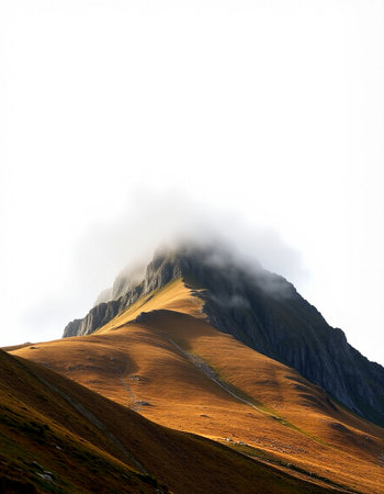 A solitary figure stands on the summit of a rugged, earthy-toned mountain, enveloped in thick white fog. A sense of achievement, freedom, and solitude in nature.
