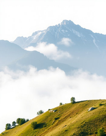 Experience the breathtaking beauty of a misty valley surrounded by rolling hills under a clear sky at dawn, embodying nature's serene tranquility and vibrant colors.