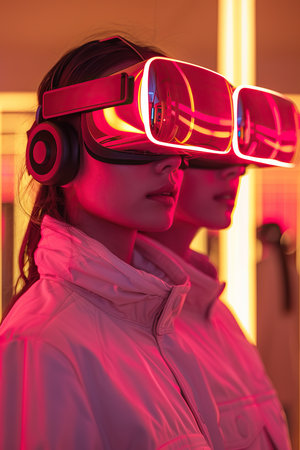 A woman wearing a virtual reality headset is standing in front of a neon sign. The neon sign is colorful and has a futuristic vibe