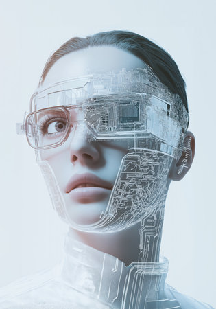 Futuristic Young Woman Wearing VR Headset with Digital Data Projection on Face in Cyberpunk Neon Light.