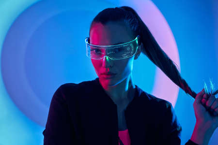 Confident young woman in futuristic glasses standing against colorful background