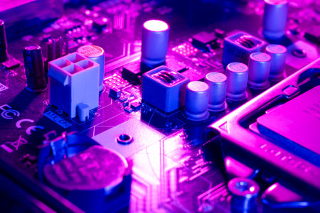 computer motherboard in blue dark background close-up.