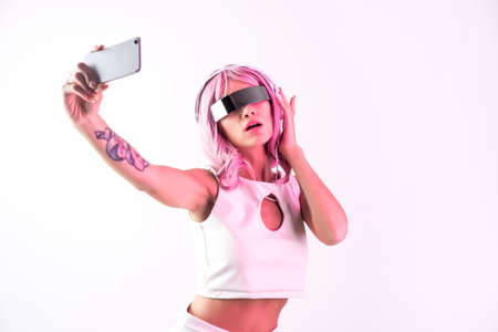 Young woman with pink hair dancing and having fun. Colored gel portraits with futuristic outfit