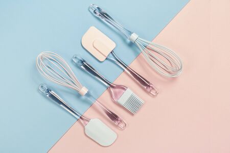 Blue and pink silicone kitchen utensils ob pink and blue background, top view