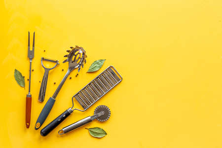 Kitchenware cooking tools and utensils. Cooking background, flat lay