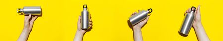 Collage of male hands holding aluminum reusable thermo water bottles. Panoramic background of yellow color.