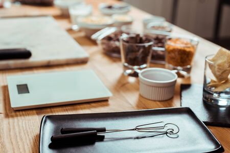 Kitchen utensils on a wooden background. Various kitchen utensils on wooden table. Chef tools. Home cooking.