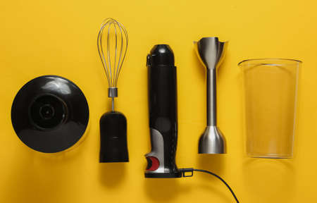 Electric hand mixer. Set of nozzles and containers for blender on yellow background. Top view, flat lay