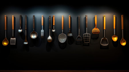 set of cooking utensils arranged in modern and sleek setting for elegant appeal, created with generative ai
