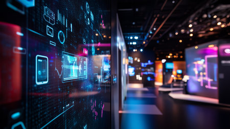 A captivating scene featuring futuristic interactive digital screens, showcasing vibrant colors and innovative designs, perfect for technology and exhibition themes.