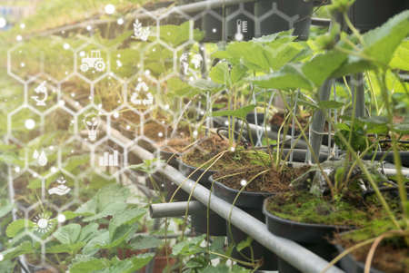 Plants background with biochemistry structure. Natural and science concept with virtual icon at the background.