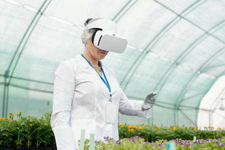 Farmer or researcher in vr headset standing in front of flower seedlings during new scientific experimentation