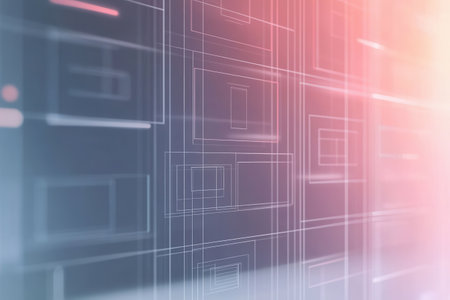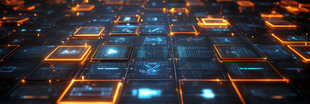 An abstract image presents a mosaic of luminous squares in shades of blue, orange, and yellow. The composition features a textured appearance with blurred edges and contrasting light. Suitable for use in technology-related projects, the image conveys a sense of digital complexity and artistic visualization. It could be used in design or editorial contexts.