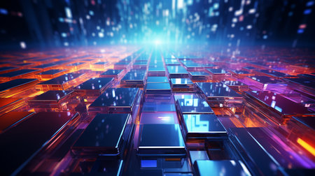 This vibrant abstract grid pattern features glossy tiles illuminated by neon lights, creating an eye-catching design ideal for modern projects.